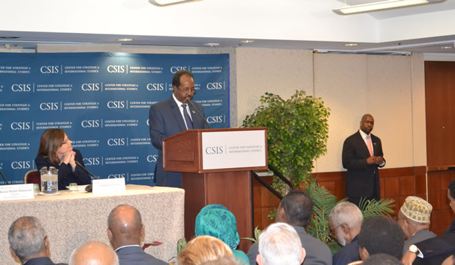 Madaxweynaha ayaa ka codsaday in ay jaaliyadaha Soomaaliyeed in qayb ka qaataan dib u dhiska dalka Soomaaliya isaga xusay in hadda laga baxay ku-meel-gaarnimada oo hadda ay Soomaaliya tahay dowladda dhameystiran. "Dadka qurba-joogta ah waxay sugayaan in dalka uu amni noqdo kaddibna ay ku noqdaan, annagana waxaan dooneynaa in aad dalka ku soo noqotaan oo aad amnigiisa iyo dib u dhiskiisa ka shaqeysaan, marka labaas tee baa hormareysa"ayuu kula kaftamay dadkii uu kula hadlayay xarunta CSIS.