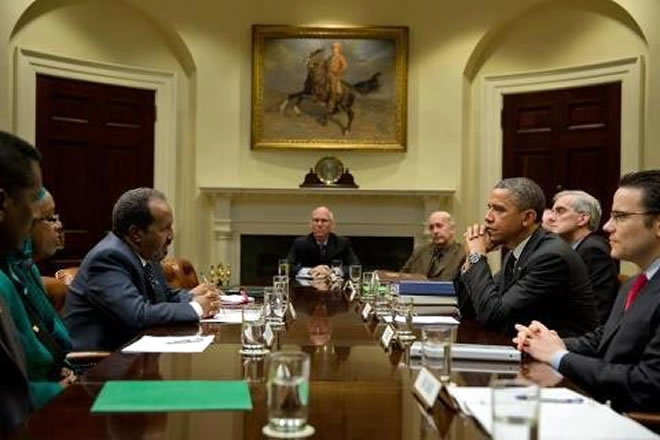 Khamiis, January 17, 2013 (HOL) - Madaxweynaha dalka Mareykanka Barack Obama ayaa maanta Aqalka Cad kula kulamay Madaxweynaha Soomaaliya Xasan Sheekh Maxamuud.