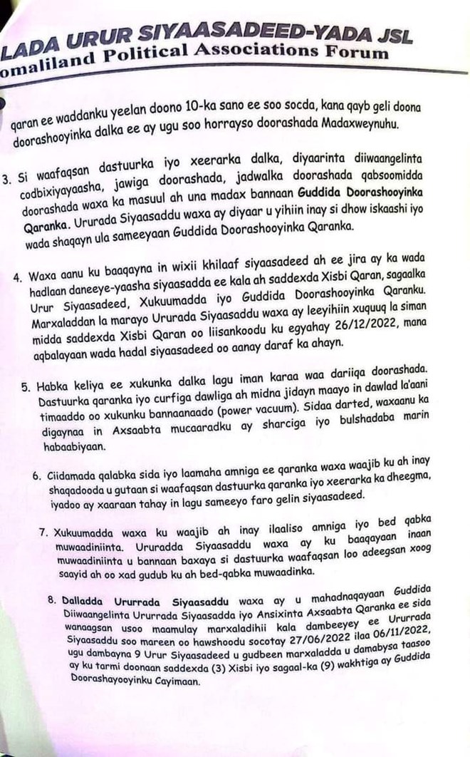 "Waxaanu ku baaqaynaa in wixii khilaaf siyaasadeed ah ee jira ay ka wada-hadlaan, daneeyayaasha siyaasada ee kala ah, saddexda xisbi qaran, 9-ka urur siyaasadeed, xukuumada iyo guddida doorashooyinka qaranka, marxaladan la marayo ururada siyaasadu waxay leeyihiin xuquuq la siman mida saddexda xisbi, ee liisankoodu ku egyahay 26/12/2022, mana aqbalayno wadahadal siyaasadeed oo anaan daraf ka ahayn".