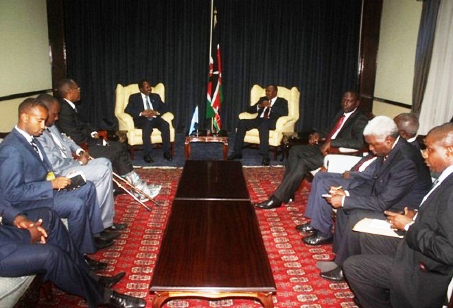 President Uhuru Kenyatta on Tuesday evening met and held talks with President Hassan Sheikh Mahmoud of Somalia at State House, Nairobi.During the meeting also attended by Deputy President William Ruto, President Kenyatta assured the Somali President that Kenya will continue to work with his country’s leadership to consolidate peace and security.