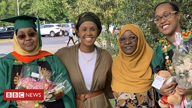The family came to the US as refugees in 1980, but her husband returned to Somalia and was killed in fighting. Falhad raised their two daughters Amina and Sofia on her own, working to ensure their education.She and Amina told the BBC's Newsday programme about returning to the classroom in her 50s, and how she fulfilled a promise she had made decades before.