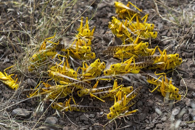 File photo: Saturday, Feb. 1, 2020, a group of desert locusts mate on the ground in Nasuulu Conservancy, northern Kenya. (AP Photo/Ben Curtis).
