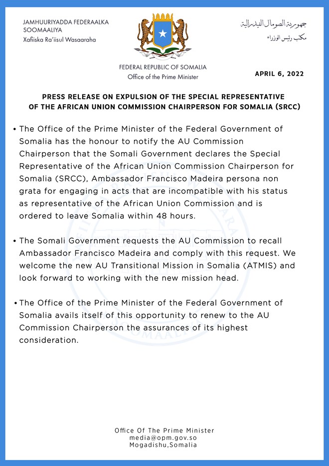 Francisco Maderia is not the first foreign diplomat to be expelled from Somalia. In early November 2021, Somalia declared Maderia's deputy, Simon Mulongo, as persona non grata for his support of an AU proposal that would have seen AMISOM fold into a joint AU-UN force instead of the Somalia-supported Somali Transition Plan.
