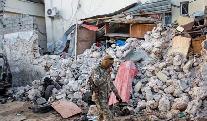 FILE - A soldier walks past wreckage after an attack on the Afrik hotel in Mogadishu, Somalia, Feb. 1, 2021. Though security forces eventually ended the attack, Somalia's government warned on Saturday that anyone who pays extortion money to al-Shabab would face legal action.