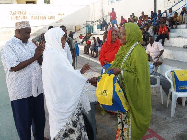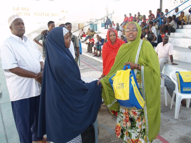 Haddaba Xaawo Taako Qalabkii Isboorti ee ay ka keentay Qurbaha galabta ayay ku qeybisay Garoonka Kubadda Kolayga 1da Luulyo (Ex Luujino), waxayna qalabkaas ku kala wareejisay Ku simaha Guddoomiyaha Xiriirka Soomaaliyeed ee Kubadda Kolayga Ibraahim Xuseen Rooble iyo Gabdho Kubadda Kolayga ciyaari jiray oo diyaarinaya ciyaartoy cusub oo gabdho ah.
