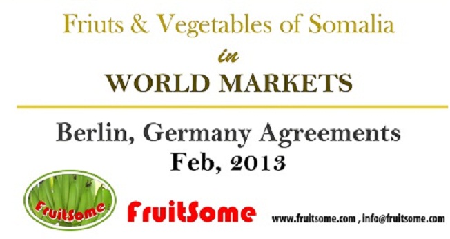 Arbaco, Feberaayo 13, 2013 (HOL) — Magaalada Berlin ee dalka Jarmalka ayaa lagu soo gabagabeeyay shirweyne caalami ah oo looga hadlayay dhoofinta Mooska iyo miraha kale kaasoo socdey 06 illaa 09 bishaan feberaayo, arrimo ku saabsana shirkaas iyo heshiisyo ay soo gashay ayay mas’uuliyiinta shirkadda Fruitsome kaga warbixiyeen xaruntooda Muqdisho ee Soomaaliya.