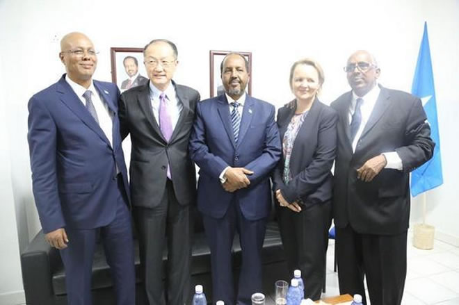 Somali President Hassan Sheikh Mohamud (center) with United Nations Secretary-General Ban Ki-moon (second from left) and delegates from the Islamic Development and World Banks in Mogadishu on Oct. 29, 2014.