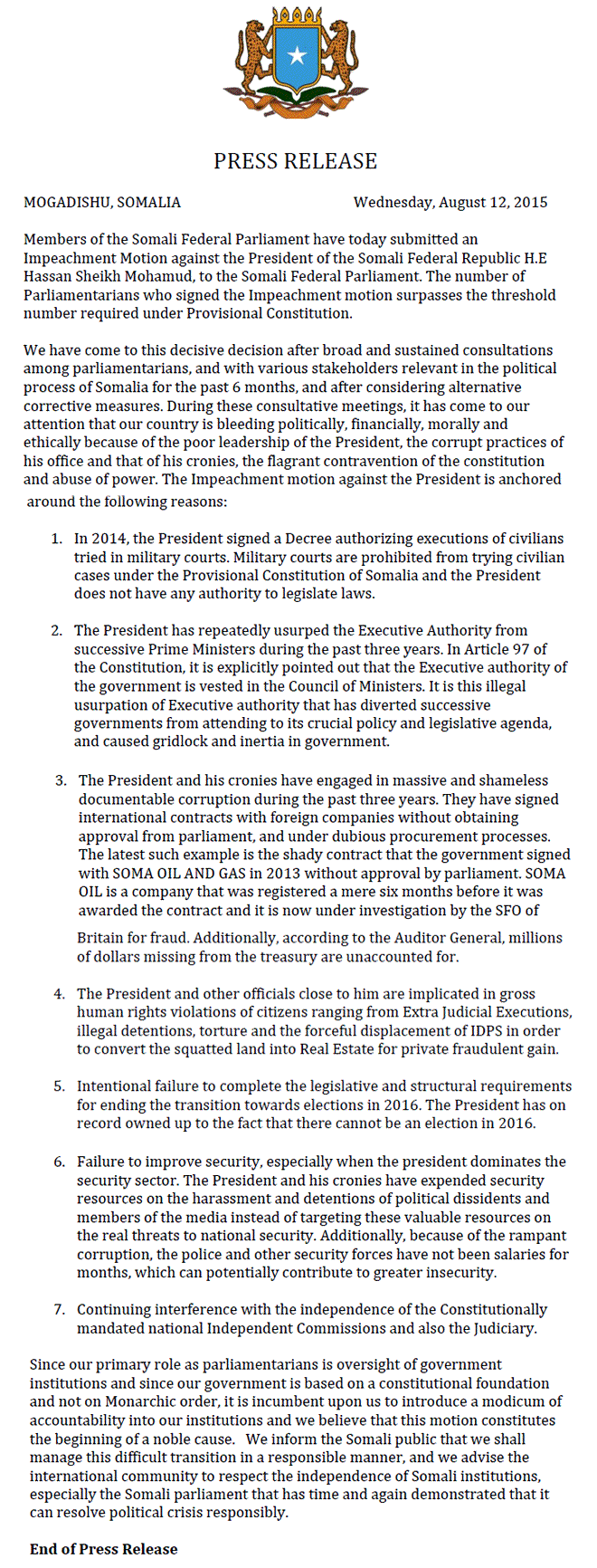 A motion has been lodged with the office of the parliamentary speaker and needs a Supreme Court ruling on its legality before it can be discussed in the assembly, Abdiweli Mohamed Qanyare, a lawmaker, said by phone.