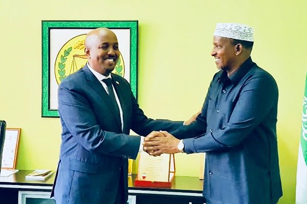 New Somaliland envoy to Kenya Bashe Omar (left) welcomes Kenya's National Assembly Majority Leader Aden Duale at the liaison office in Nairobi on September 19, 2018. Mr Duale paid him a courtesy call. PHOTO | COURTESY