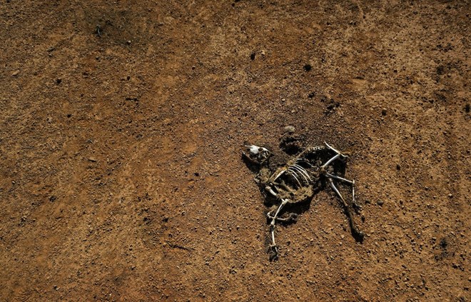 The carcass of a dead goat lies in the desert in a drought-stricken area near Bandar Beyla in Somalia on March 8, 2017. The United Nations’ emergency relief coordinator said on June 4, 2019, that more than 2 million men, women and children could die of starvation in Somalia by summer’s end if international aid is not sent quickly to the drought-stricken African country. (AP Photo/Ben Curtis