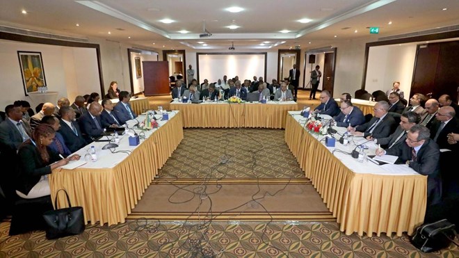 L-R) Ethiopian, Sudanese and Egyptian delegations taking part in a new round of talks over the Grand Ethiopian Renaissance Dam (GERD), in Khartoum, Sudan, 22 December 2019. EPA/MARWAN ALI