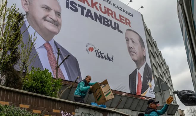 Workers pick up the garbage next to a billboard reading "Thank You Istanbul" and portraying AKP ruling party mayor candidate Binali Yildirim and President Recep Tayyip Erdogan, in Istanbul, on April 2, 2019. (photo credit: BULENT KILIC / AFP)