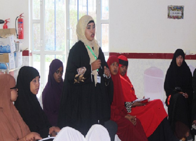 Faduma Yussuf speaks during the UN-Habitat supported job fair in Bosaso, Puntland, Somalia