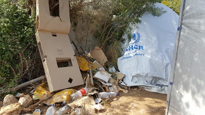 Around us, shabby tents patched with shreds of plastic sheeting, many of them ironically labeled "UNHCR", hang pitifully on the slopes of the woods. "Some families live in there", comments Sarah, sternly.