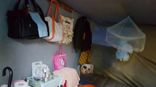 At the back of the tent, a small bed lies on a wooden structure, covered with a thin mattress, and a thick sleeping bag, her prize item, along with her mosquito net.