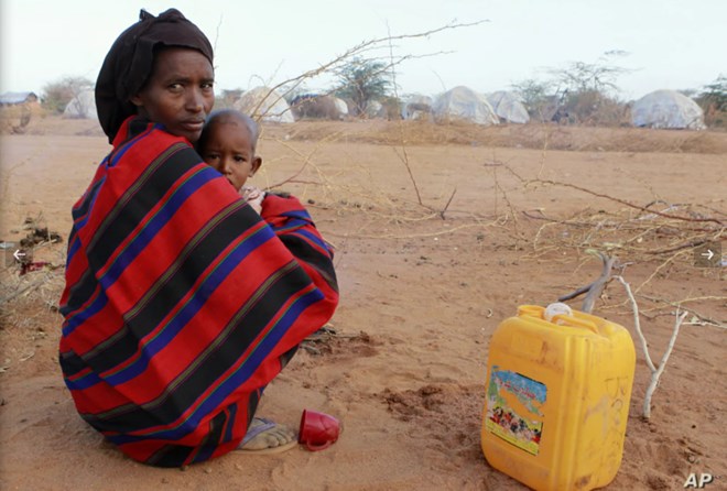 FILE - A refugee woman and her child from Somalia sit in the open as they camp with their belongings outside Ifo refugee camp in Dadaab, near the Kenya-Somalia border, July 30, 2011.