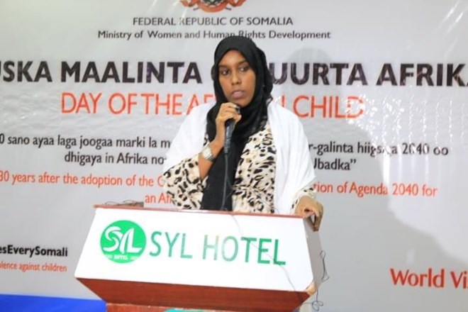 The Minister of Women and Human rights Development of the FGS, Hanifa Mohamed Ibrahim, speaking about the International Day of the African Child & importance of educating Somali Children on June 16, 2021. CREDIT: SNTV