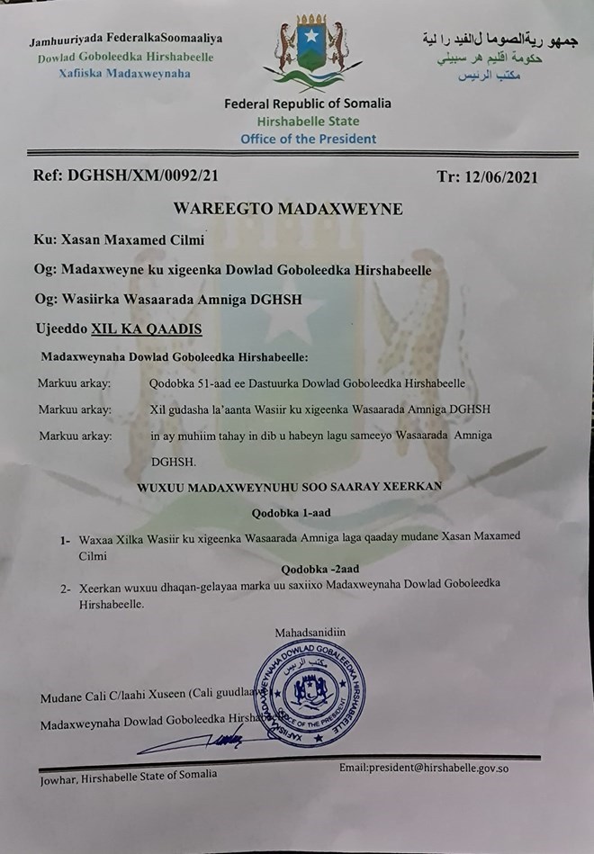 Beledweyne (HOL) - The President of Hirshabelle, Ali Abdullahi Hussein, has fired his deputy security minister of the Hirshabelle region Hassan Mohamed Elmi on Friday.
