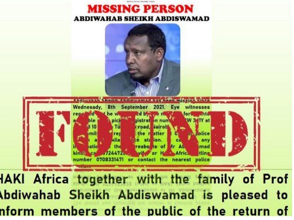 “We are pleased to inform members of the public that Sheikh Abdiswamad was returned on Sunday evening on September 19, 2021, and is now with his family. More information will be shared by the family in due course,” said Mr Khalid.