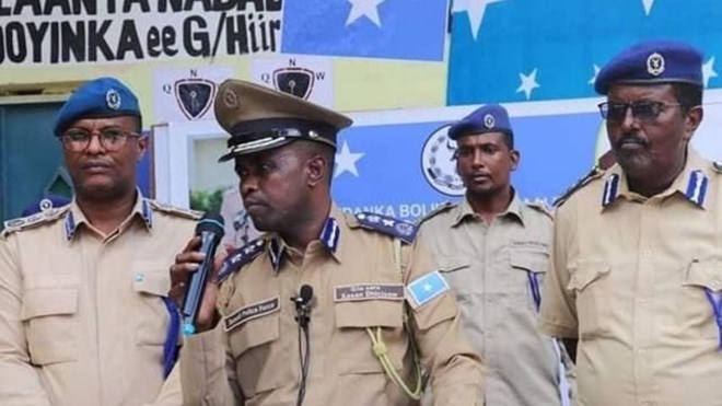 Hirshabelle Police Commissioner Hassan Dhiesow Hassan (with microphone) flanked by senior police officers in Beleweyne, Hiran region. Somalia’s ongoing victories against Al-Shabaab militants could be hurt by overzealous officials wary of critical media, press freedom lobbyists warned on Friday. PHOTO | HIRSHABELLE POLICE