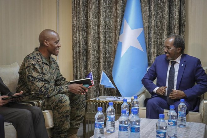 Photo By Africom Pao | U.S. Marine Corps Gen. Michael Langley, commander, U.S. Africa Command, meets with Somalia President Hassan Sheikh Mohamud in Somalia on Aug. 29, 2022. The visit came as part of a four-day trip to Djibouti, Somalia, and Manda Bay, Kenya, from August 28-31, 2022, to meet with host nation leaders, senior interagency officials, and deployed troops to better understand the political and military situation in East Africa, discuss shared concerns and priorities, and see ongoing operations firsthand.