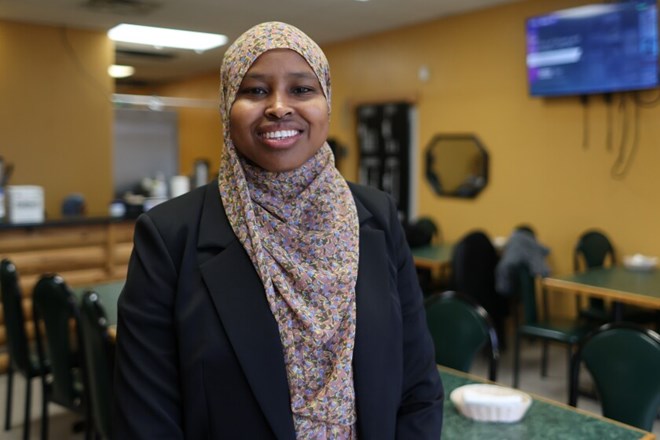 Hamida Dakane stands in the Al Hamdi Restaurant on Wednesday, Nov. 9, 2022, in south Fargo. Photo credit: Michael Vosburg/The Forum