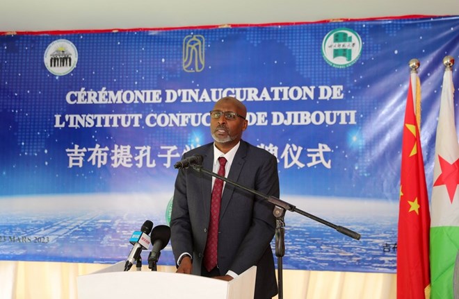 Minister of National Education and Vocational Training of Djibouti Moustapha Mohamed Mahamoud speaks at the inauguration ceremony of Confucius Institute in Djibouti City, Djibouti, on March 23, 2023. (Xinhua/Wang Ping)