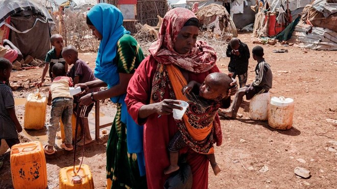 A woman gives water to her child at Tawkal 2 Dinsoor camp for internally displaced persons in Baidoa, Somalia, on February 14, 2022. PHOTO | AFP