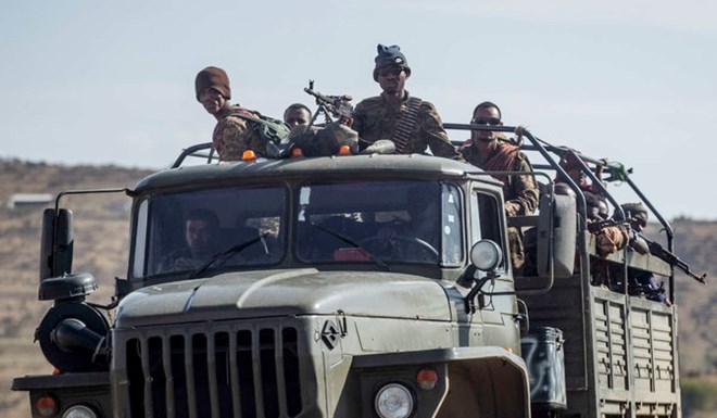 In this Saturday, May 8, 2021 file photo, Ethiopian government soldiers ride in the back of a truck on a road near Agula, north of Mekele, in the Tigray region of northern Ethiopia. (AP)