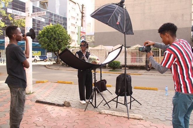 Awadh Salim (R), a 26-year-old photographer, takes a photo of a client in Nairobi, the capital of Kenya, on Nov. 12, 2023. (Photo by Chrispinus Omar/Xinhua)