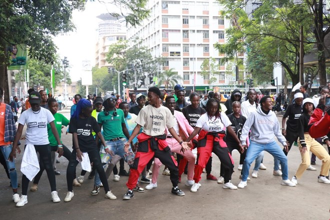 Kenyan youth dance in a street in Nairobi, the capital of Kenya, on Nov. 26, 2023. (Photo by Allan Mutiso/Xinhua)