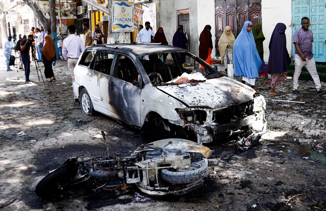Somalis walk past the wreckage of a vehicle and a motorcycle destroyed at the scene of a suicide bomb blast at the Hamar Weyne district of Mogadishu, Somalia January 16, 2024. REUTERS/Feisal Omar Acquire Licensing Rights