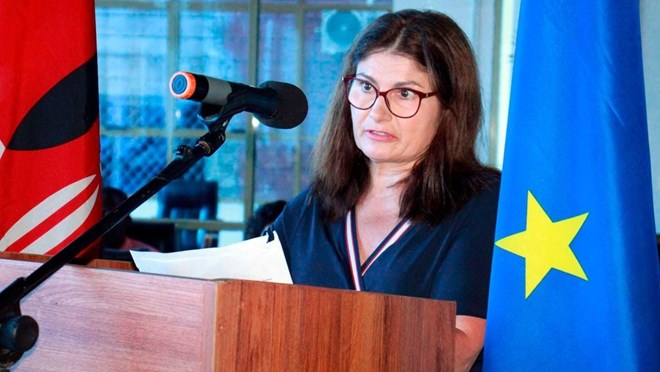 European Union Ambassador Henriette Geiger addresses the press at the end of bilateral training between European Naval Force, Kenya Navy and the Kenya Coast Guard Service personnel on May 23, 2024. PHOTO | WACHIRA MWANGI | NMG