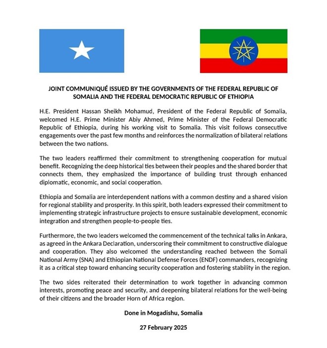 In addition to security, economic collaboration was a significant focus. Mohamud and Abiy emphasized expanding cross-border trade, streamlining customs policies, and investing in key infrastructure projects. As a landlocked nation, Ethiopia has long sought maritime access. The meeting discussed establishing stronger economic linkages with Somalia’s ports, as Mogadishu views regional economic cooperation as essential for long-term stability.