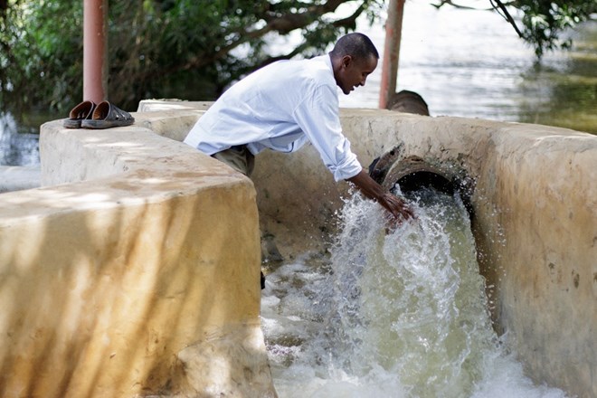 Ali Abshir Ahmed, a farmer, checks water flowing into an irrigation canal in Afgoye, Somalia, on 4 December 2024. FAO/Arete/Mohamed Mohamud Abdi.