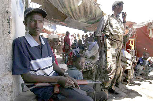 | FEW PROSPECTS: Aden Osman, left, sits in the crowded marketplace in Baidoa, Somalia. With no education, Aden, 19, reluctantly works as a gunman to support his parents and three sisters. (Evelyn Hockstein / LAT) |