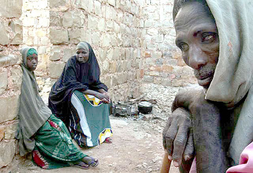 The family settled in Baidoa in 2003, after drought made survival in the bush impossible. Now they squat in a half-finished building on the edge of town with dirt floors and no roof, doors or windows. The family of six shares a small room with mattresses on the ground and worn sheets of gray plastic patching gaps in the walls.