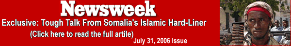 But Somalia's troubles are far from over. Instead of warlords now, Somalis have what many are calling an African version of the Taliban, bent not only on imposing a harsh, Wahhabi-style Islam on the country but allegedly also providing a safe haven, Afghan style, for international terrorists. Movies and music have been banned; open-air video parlors showing World Cup matches were shut down. Recently the group appointed a Majlis al-Shura (consultative council) as its supreme spiritual and policy-setting body, appointing as its leader Sheik Hassan Dahir Aweys, who is on the U.S. terrorist watch list for his connection to a Somali militant group, Al Itihad al-Islamiya. In an exclusive interview with NEWSWEEK last week in Mogadishu, Aweys didn't deny his connection to the militant group but said, "I don't know anything that Al Itihad al-Islamiya did to America. The Americans are targeting us, and there is no power that can protect us from them except Allah." Aweys insisted the group was interested only in opposing Ethiopia, which late last week moved its troops across the border, warning the Islamists against taking complete control of Somalia.