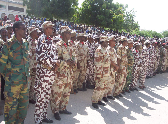 Jimco, January 05, 2007(HOL): Ilaa 3837 Askari oo ka tirsan Ciidamada Xoogga dalka Soomaaliya ayaa maanta waxaa lagu rigeeyay Barxadda Xaruntii Xisbiga ee Magaalada Muqdisho, halkaasi oo ay ugu qudbeeyeen mas’uuliyiin ka tirsan Dowladda Federaalka Soomaaliya oo uu horkacayay Ra’iisal Wasaare Cali Maxamed Geedi.