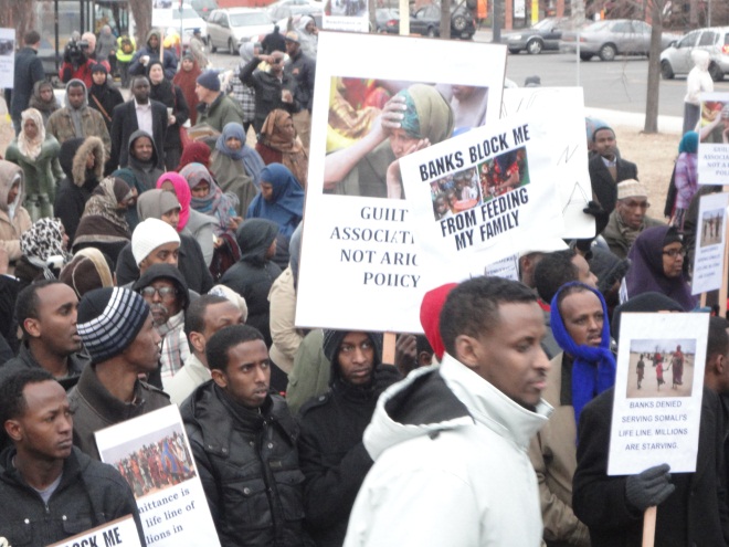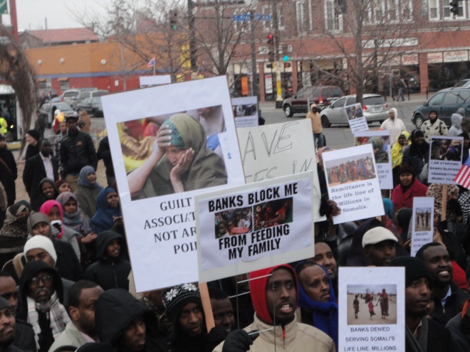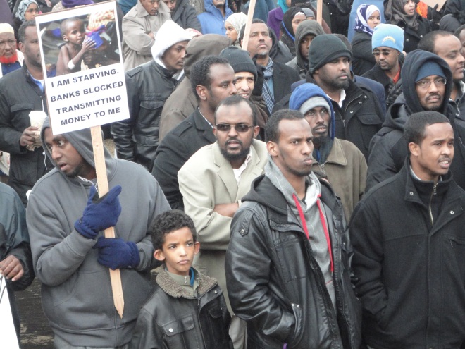 Axad, January 01, 2012(HOL): Boqolaal ruux oo ka mid ah Soomaalida ku dhaqan gobolka Minnesota ayaa maanta isugu soo baxay magaalada Minneapolis, kuwaasi oo doonayey in ay muujiyaan sida ay uga xun yihiin go’aankii uu qaatay bangigii joojiyey lacagihii uu xawaaladaha Soomaalida u gudbin jiray.