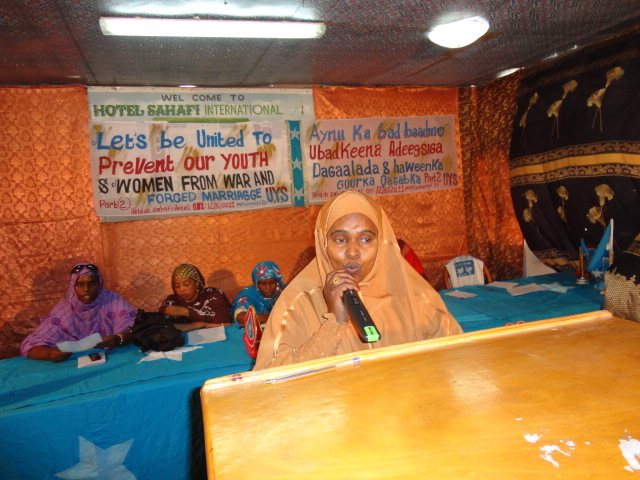 Khamiis, May 12, 2011 (HOL) – Hay'adda midowga dhalinyarada Soomaaliyed ee UYS ayaa siminaar ugu qabatay magaalada Muqdisho in ka badan 100 haween ah oo ka kala socday qaybaha bulshada Soomaaliyeed, iyadoo siminaarkan looga hadlayay qaabka ubadka looga badbaadin karo adeegsiga dagaalada iyo sida looga hortagi karo guurka qasabka ee haweenka.