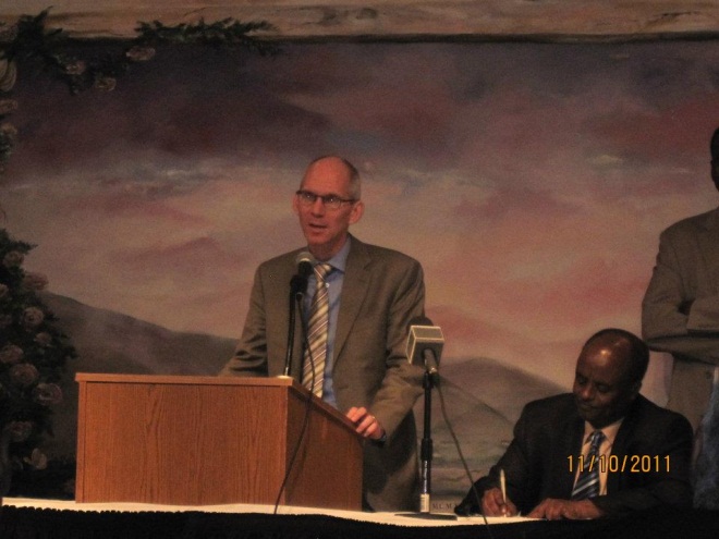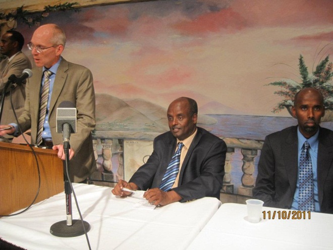 Arbaco, November 09, 2011 (OHL)- Waxaa magaaladda Columbus, Ohio, booqasho gaaban ku yimid ergeyga wakiilka uga ah dawladda Mareykanka arimaha Somalia Mr. James Swan oo ay ujeedadiisu aheeyd in uu qorba joogta Somaliyeed ka dhaadhiciyo una sharxo siyaasdda dawladda Mareykanka ay ka damacsantahay Somalia iyo qaabka loo wajahayo hindisaha loo yaqaano DUAL TRACK oo la rabo in lagu maamulo degaanadda Somalia. Waxa goobtaas ka hadla safiirka Mr. Swan oo aad uga hadlay in dawladda Mareykanka ay rabto isla markaana ay dadaal dheer ugu jirto in lo helo Somalia xal nabadeed iyo kala danbeen ku saleysan sharci iyo ismaqal.