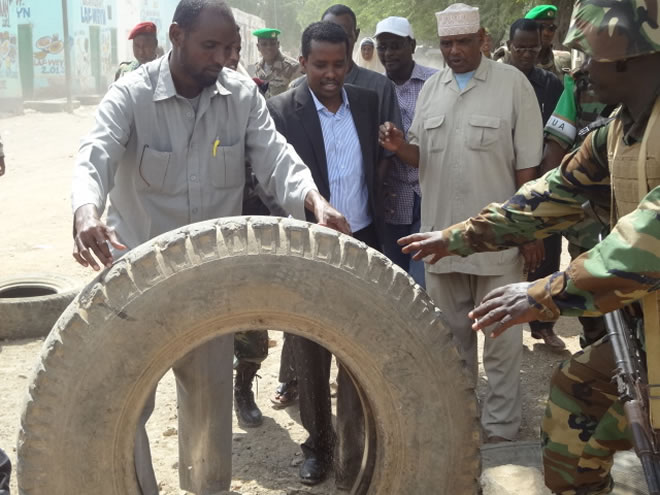 Guddoomiyaha gobollka Hiiraan C/fitaax Xassan Afrax oo wehliyaan saraakiisha AMISOM ayaa la arkayay isaga oo gacatiisa ku qaadaya Taayaro iyo wax yaabo kale oo wadada ku go’naa, wuxuuna sheegay in wixii hadda ka danbeeya gadiidka iyo dadweyaha si caadi u isticmaali karaan wadada dheer ee dhexmarta bartamaha magaalada Baladweyne.