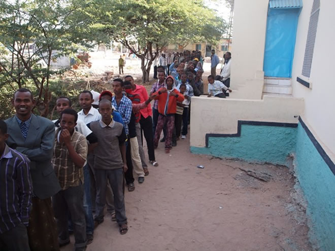 Arbaco, November 28, 2012 (HOL) — Guud ahaan gobolada iyo degmooyinka Somaliland waxa si weyn loogu dareeray sidii dadweynuhu ugu codayn lahaayeen musharaxiinta ka sharaxan degmooyinkooda, waxaanay Dadweynuhu saaka arooryadii hore safaf dhaadheer u galeen goobaha laga codaynayo, iyagoo si degan ugu jira sefefka una samraya cadceedda kulul iyo wakhtiga dheer ee ay ku jiraan safafka.