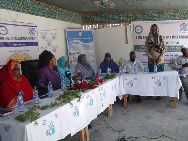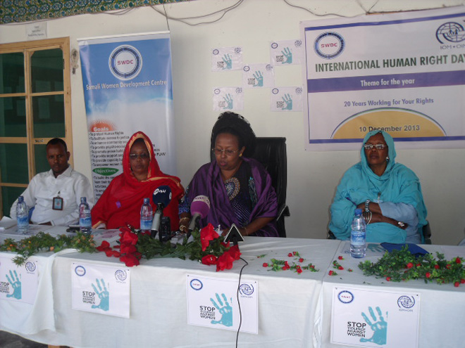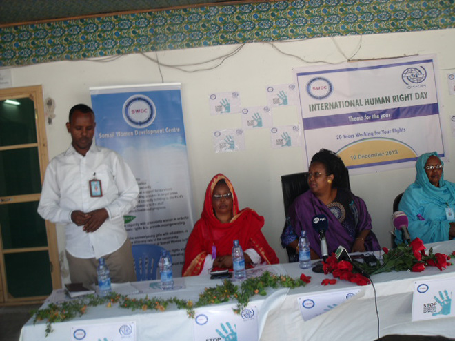 Talaado, December 10, 2013 (HOL) — Maanta oo ay ku beegan tahay maalinta caalamiga ah ee xaquuqda aadanaha adduunka ayaa xus ku saabsan arrintan waxaa lagu qabtay maanta xarunta hay’adda Somali Women Developments Center (SWDC) ee magaalada Muqdisho, waxaana ka qaybgalay xuskaas mas’uuliyiin ka tirsan dowaldda Somalia, culimaa’uddiin, aqoonyahanno, siyaasiyiin, mas’uuliyiinta SWDC, haween iyo dhallinyaro,