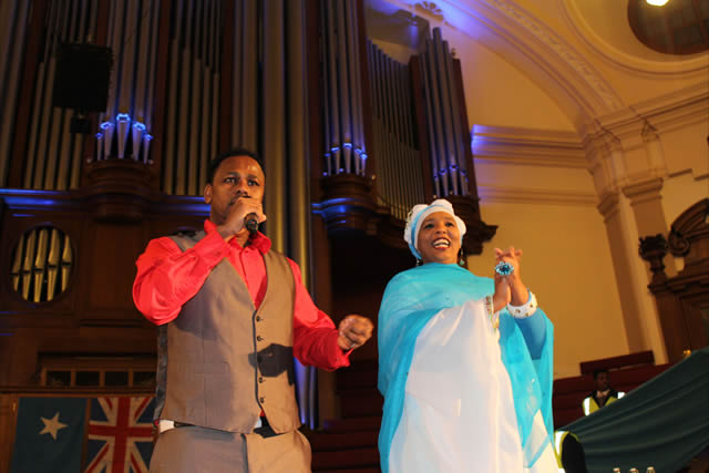 Xafladda waxaa heeso ka qaaday fannaaniinta London, gaar ahaan fannaanadda Hibaaq Maxamed Geel-qaad oo fursad u heshay in ay madaxweynaha hortiisa ka qaaddo heesteeda caan baxday ee Madaxweyne, taasi oo dadkii hoolka xaadirka ku ahaa ay aad ugu jidboodeen.