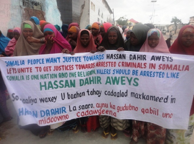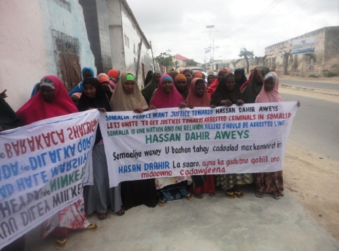Axad, July 07, 2013 (HOL) — Dibadbaxayaal haween u badan ayaa maanta ka dhigay Muqdisho bannaanbax ay ku dalabnayeen in dowladda Soomaaliya ay maxkamad soo taagto Sheekh Xasan Daahir Aweys, waxayna dadkan wateen boorar ay ku qoran yihiin inuu yahay gacan-ku-dhiigle dad badan dilay.