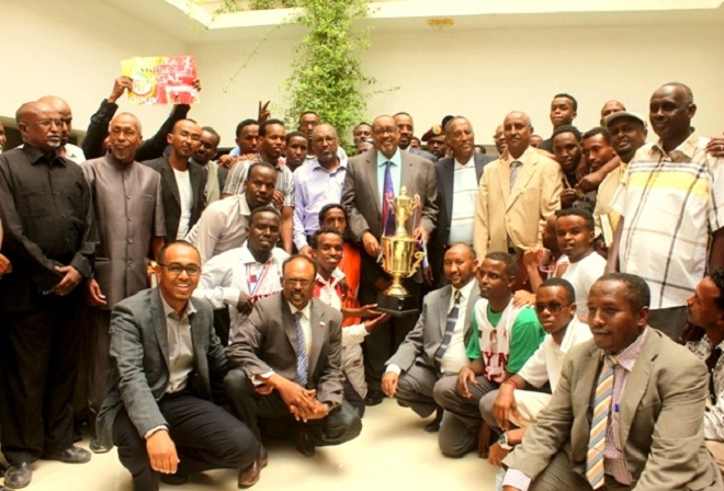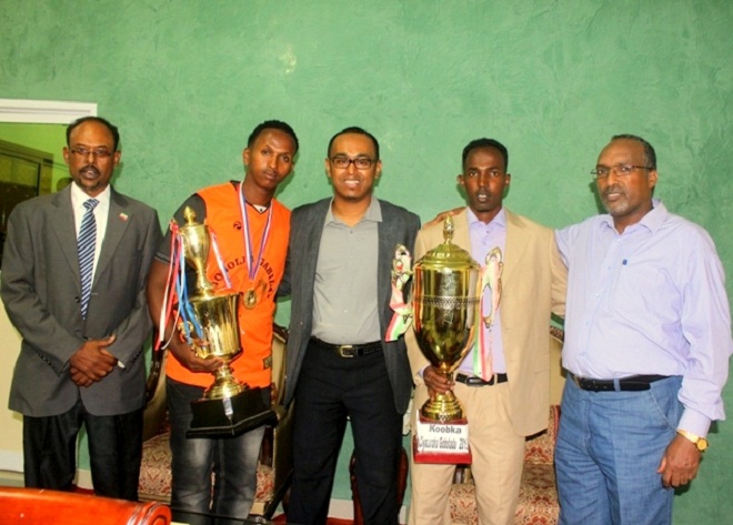Sabti, Juun 22, 2013 (HOL) — Madaxweynaha Somaliland, Axmed Maxamed Maxamuud Siillaanyo ayaa maanta qasriga madaxtooyadda ku qaabilay labadda gobol ee ku kala guulaystay koobka kubadda cagta iyo koobka kubadda Gacanta ee basketka looyaqaan.