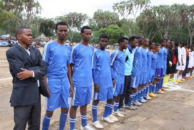 Arbaco, Juun 26, 2013 (HOL) — Wafdiga uu horkacayo wasiirrka difaaca xukuumada Soomaaliya C/xakiin Xaaji Max'uud Fiqi, safiirka dowladda Jabuuti, mas'uuliyiinta maamulka gobolka Hiiraan, saraakiisha ciidamada Jabuuti iyo dadweyne isaga kala yimid xaafadaha magaalada Baladweyne ayaa galinkii danbe ee maalintii shalay ka wada qeyb-gallay daawashada gabadbada tartanka kubada cagta oo maalmihii ugu danbeeyay ka soconayay magaalada Baladweyne.