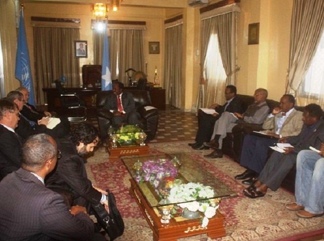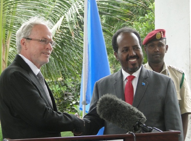 Sabti, Juun 08, 2013 (HOL) — Madaxweynaha Soomaaliya, Xasan Sheekh Maxamuud oo maanta dib ugu soo laabtay Muqdisho ayaa ugu baaqay dadka Soomaaliyeed inay la shaqeeyaan ergeyga cusub ee xoghayaha guud ee QM uu u soo magacaabay Soomaaliya iyo xafiiskiisa cusub ee UNSOM.